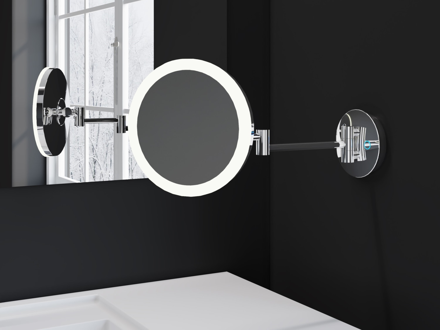 Vægmonteret makeupspejl fra COSMIC med LED lys og 5x forstørrelse. Justerbar lysfarve.