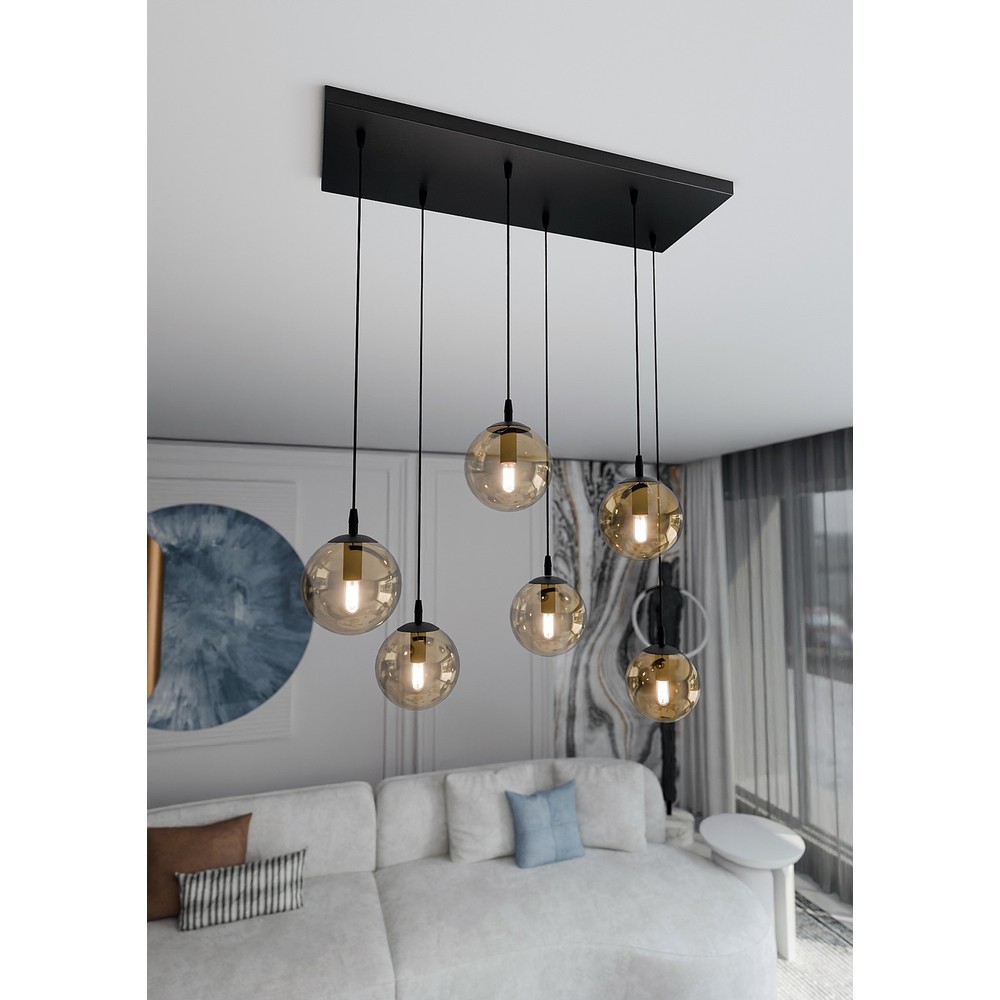 Cosmo 6 pendellampe kombinerer et moderne design med en elegant farvekombination af sort og rav. Ideel til at skabe en hyggelig atmosfære i ethvert rum.