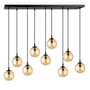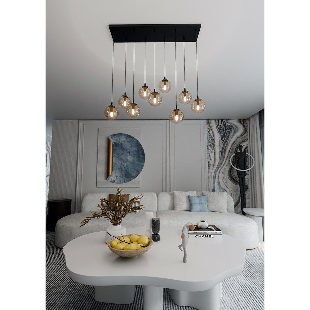 Cosmo 9 pendellampen er et stilfuldt og moderne valg til ethvert hjem. Denne lampe er designet med ni lyskilder, der er fordelt på en elegant måde, hvilket skaber en imponerende visuel effekt. Den sorte pulverlakerede stålkonstruktion kombineret med de ravfarvede glas giver et varmt og indbydende lys, der kan transformere atmosfæren i ethvert rum.