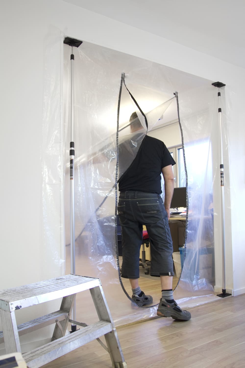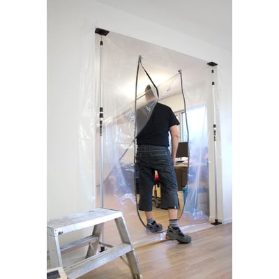 Fleksibel plastfolie med lynlås til afdækning af døråbninger under renovering. Dækker nemt større døråbninger og mindre rum.