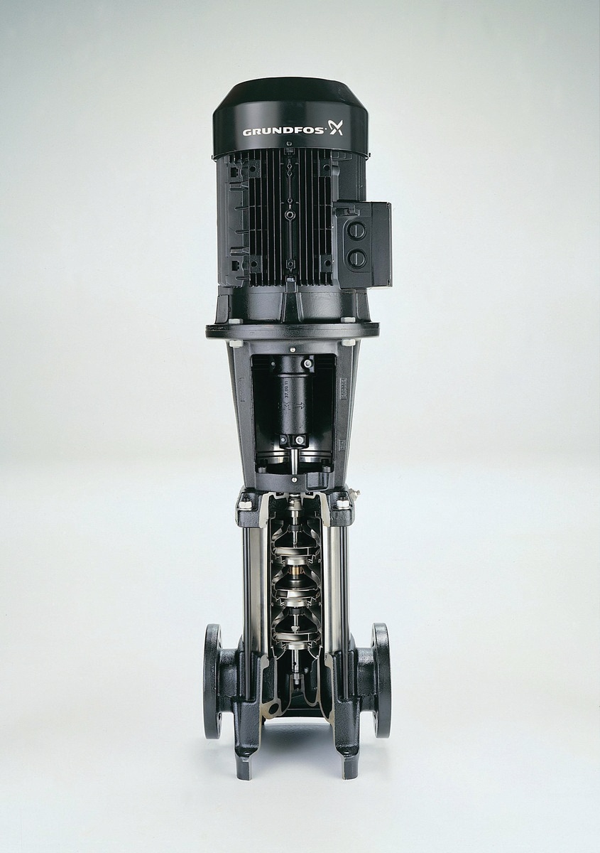 Vertikal, normalsugende in-line flertrins centrifugalpumpe til rørinstallation og fundamentmontering. Med løbere og mellemkamre i rustfrit stål.