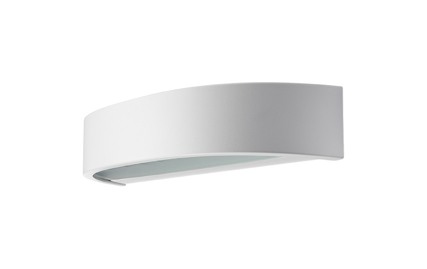 Elegant, buet LED væglampe til indendørs og udendørs brug. Kan monteres vandret eller lodret. Fremstillet i pulverlakeret aluminium med skærm i hærdet glas.