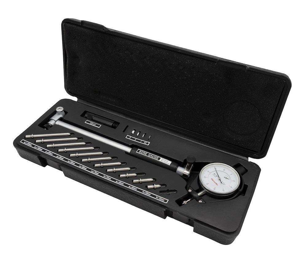 Cylindermåler til præcis måling af indvendig diameter i huller, cylindre og rør. Aflæsning: 0,01 mm. Måledybde: 150 mm.