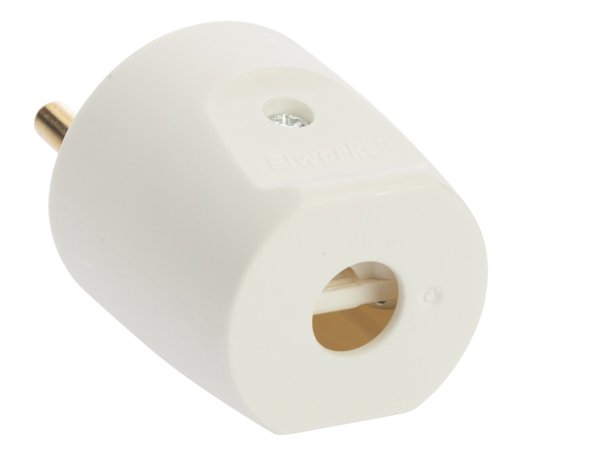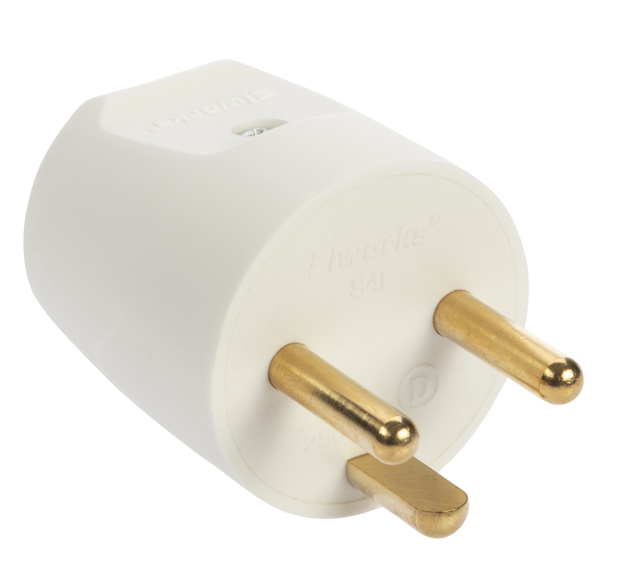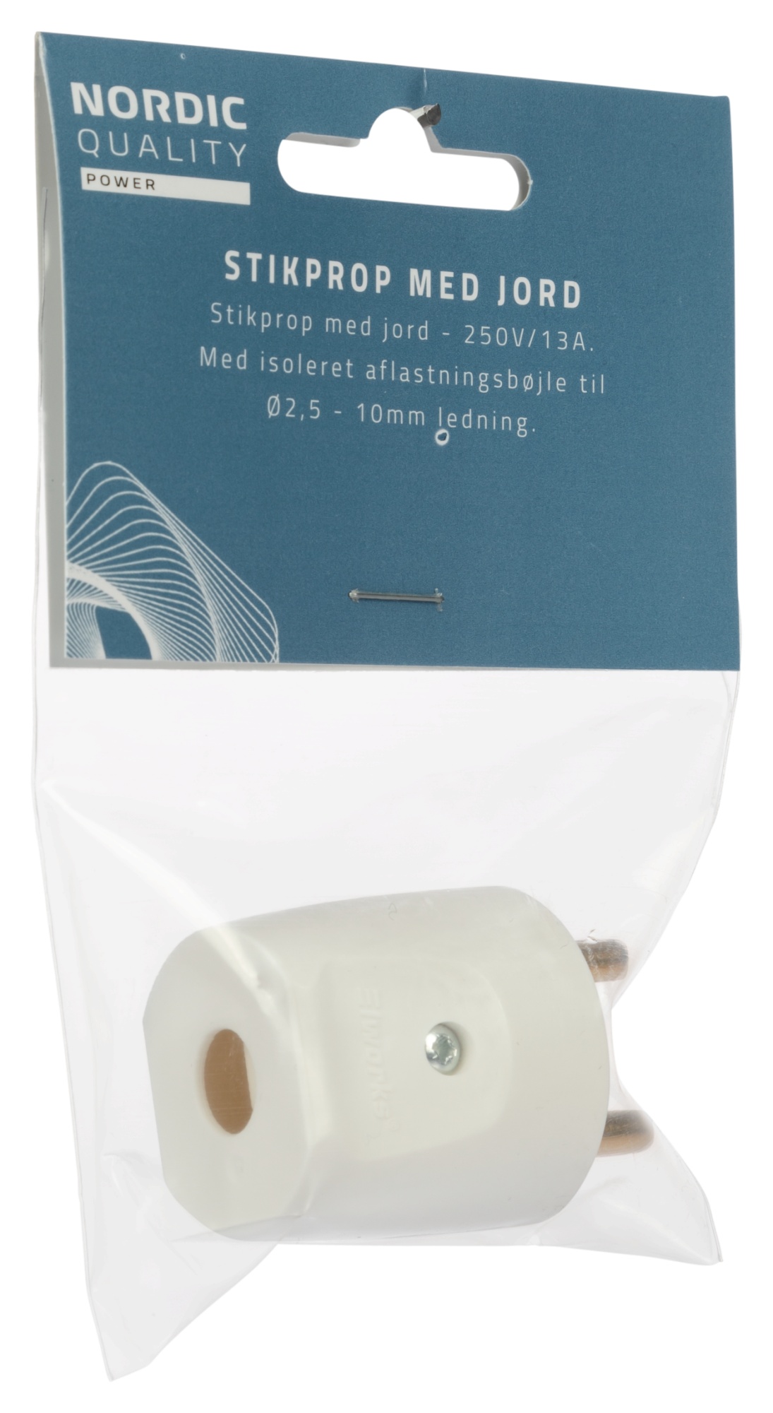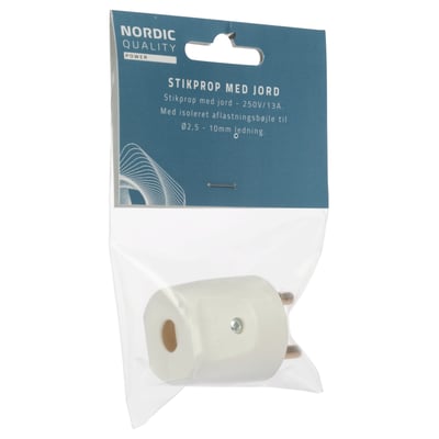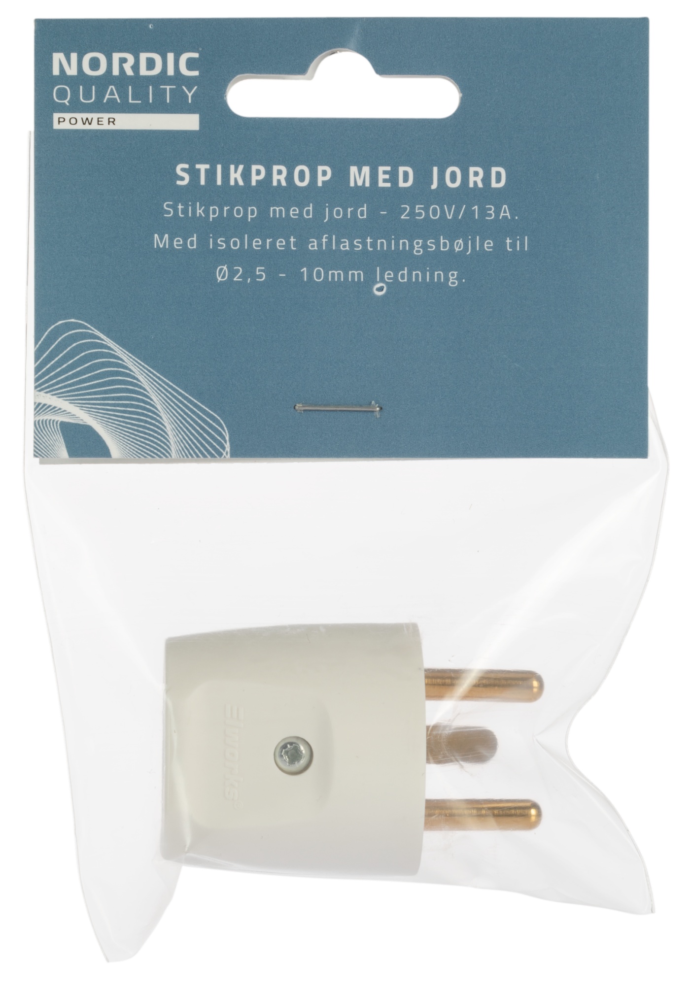 D-mærket, rundt, lige stik med jord og isoleret aflastningsbeslag.