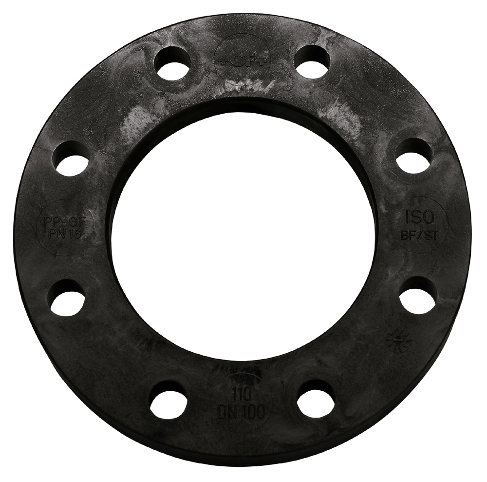 Løsflange til styksvejsesystem fra +GF+. Bruges til samling af plastrør og overgang til ventiler. Fremstillet i PP (30% glasfiberforstærket) med stålring og UV-resistent. Flange boring PN10.