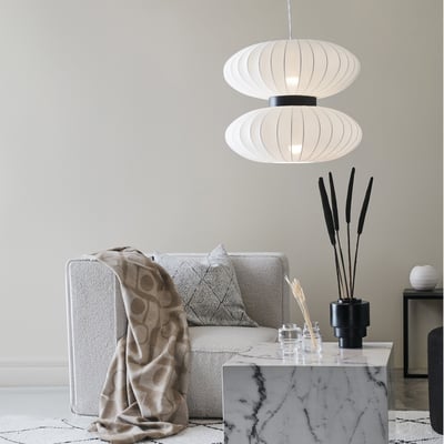 DABURU pendel med 2 fatninger, hvid finish og sort ledning. Perfekt til indendørs brug.