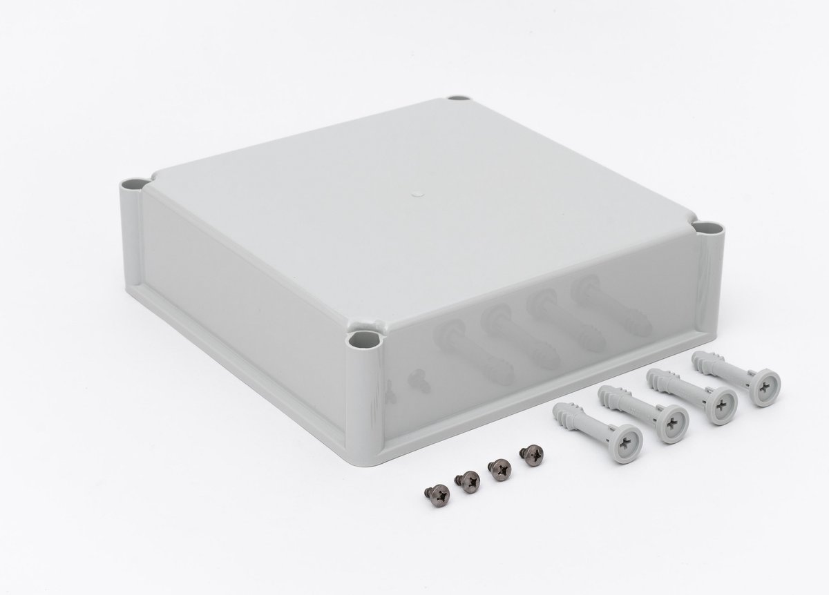 Dæksel EKO80-G i grå polycarbonat. Mål: 280 x 280 x 80 mm. Serien indeholder også dæksler med hængsler og fingerskruer.