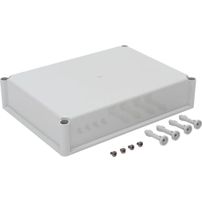 Gråt polycarbonatdæksel fra FIBOX EK SOLID serien, 380 x 280 x 80 mm, velegnet til forskellige kapslinger. Inkluderer skruer for nem montering.