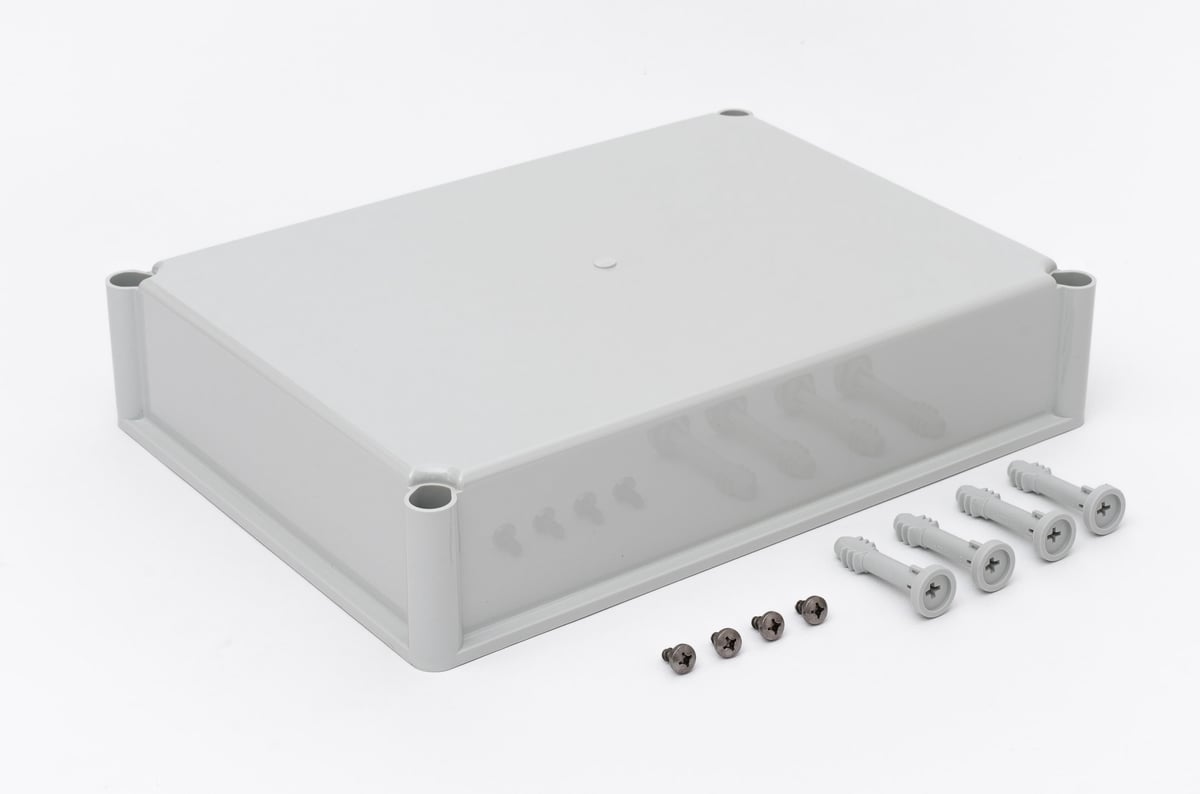 Dæksel EKP80-G fra Fibox er et solidt dæksel i grå polycarbonat, der måler 380 x 280 x 80 mm. Leveres inklusiv skruer.