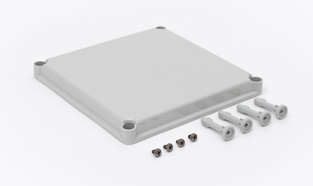 FIBOX EK SOLID dæksel i grå polycarbonat, 280 x 280 x 30 mm. Ideel til tavler og modulopbygning. Kan også fås i transparent.