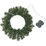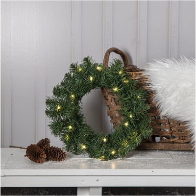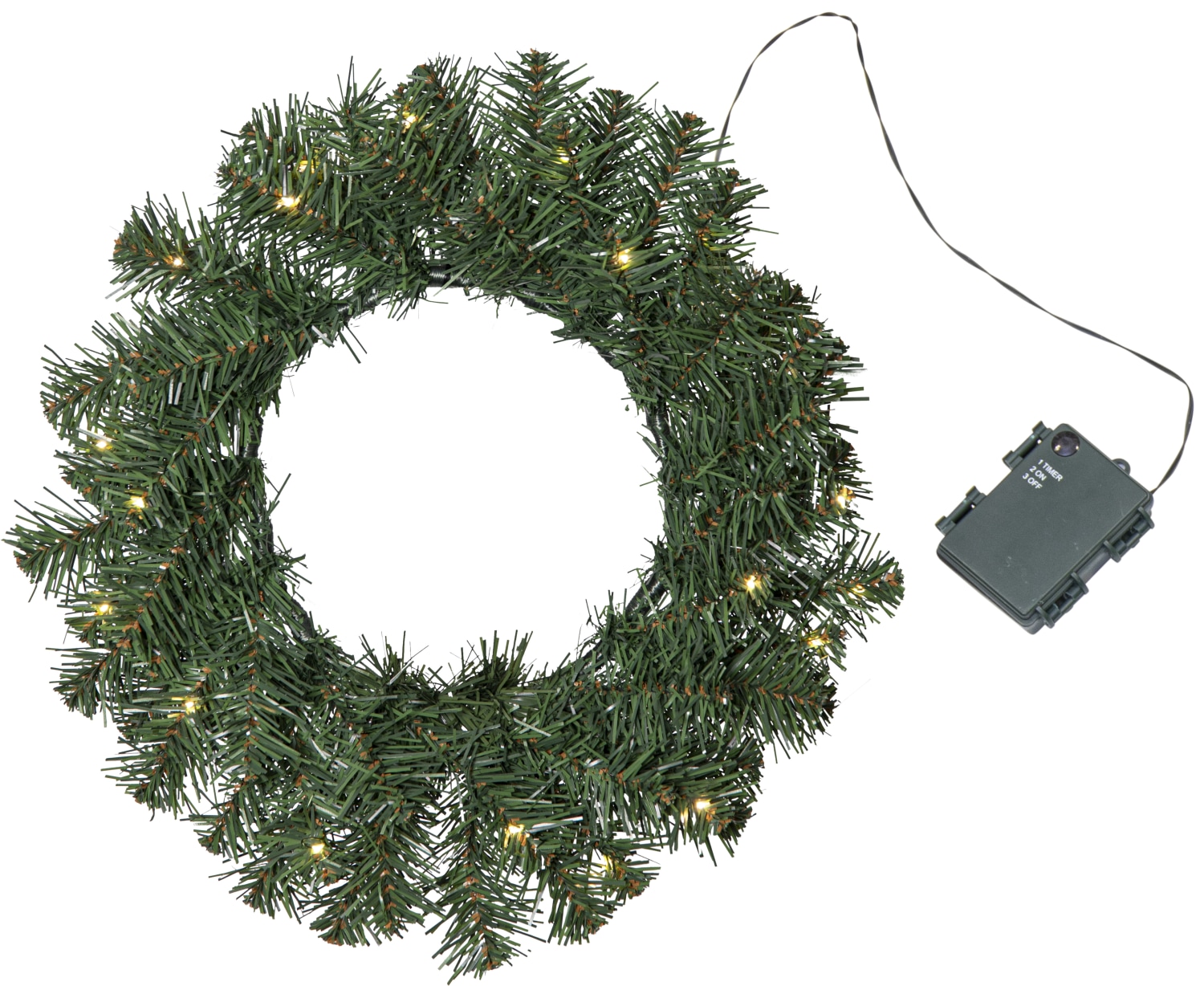 Flot julekrans i kunstgran med timerfunktion. Kransen er 40 cm i diameter og bruger 3xAA batterier (medfølger ikke). Til indendørs brug.