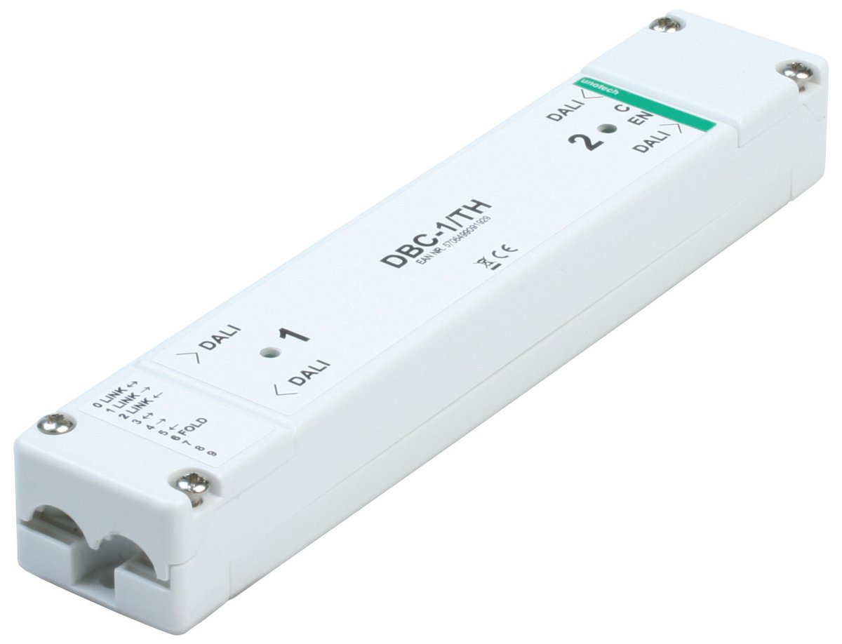 Dali modul DBC-1/TH fra Niko. Nem montering, kan kombineres med DALI tilstedeværelsessensorer, forsynes direkte fra DALI-bussen og kan sammenkoble separate DALI-busser.