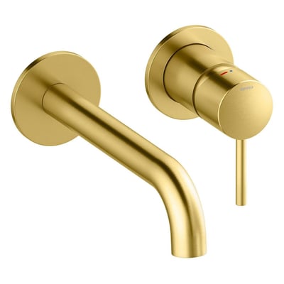 Komplet sæt af udvendige rosetter til indbygning af Osier/Merkur håndvaskarmatur fra Damixa med en 180 mm tud i børstet messing.