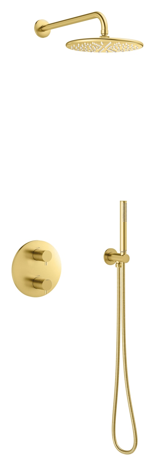 Elegant Damixa Silhouet XS1 brusesæt i børstet messing PVD. Inkluderer hoved- og håndbruser, vandbesparende funktion og skoldningsspærre. Læs mere…