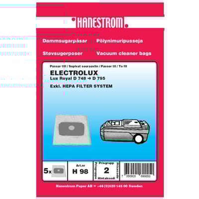 Disse støvsugerposer er kompatible med ELECTROLUX D748-795 støvsugere og produceret af Hanestrom Paper.