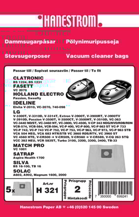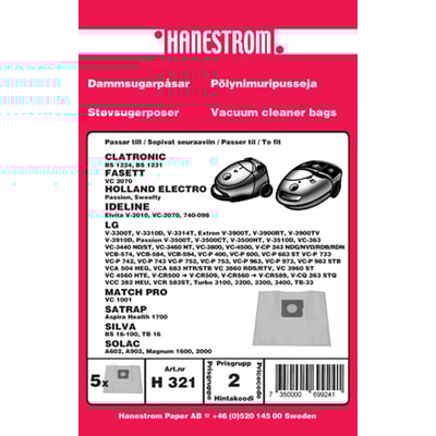 Dammsugarpåsar till LG V-3900T och EXTRON dammsugare från Hanestrom Paper.