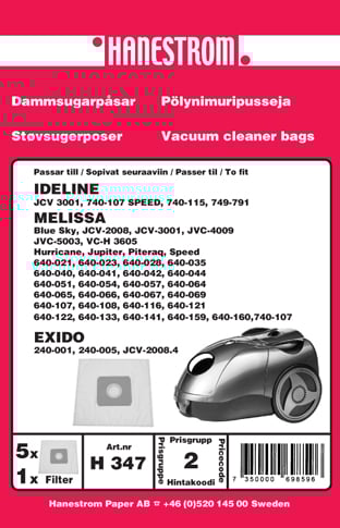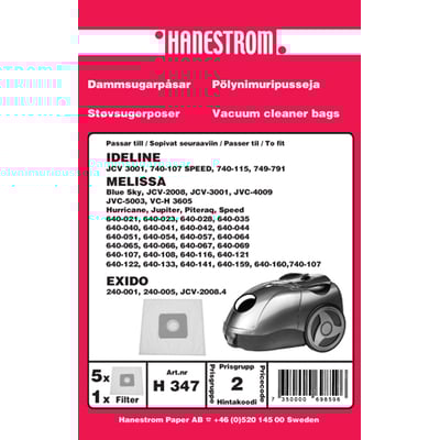 Dammsugarpåsar til MELISSA JCV-2008 og VC-H3605 støvsugere fra Hanestrom Paper.