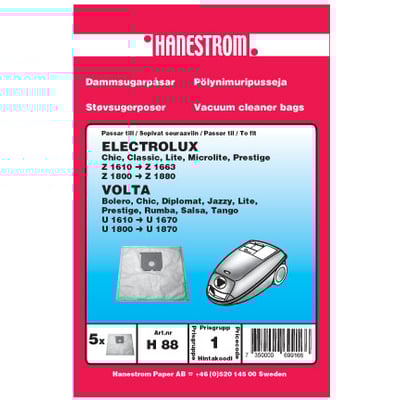 Støvsugerposer til VOLTA U 1800 - U 1870 støvsugere. Model H88 fra Hanestrom Paper.
