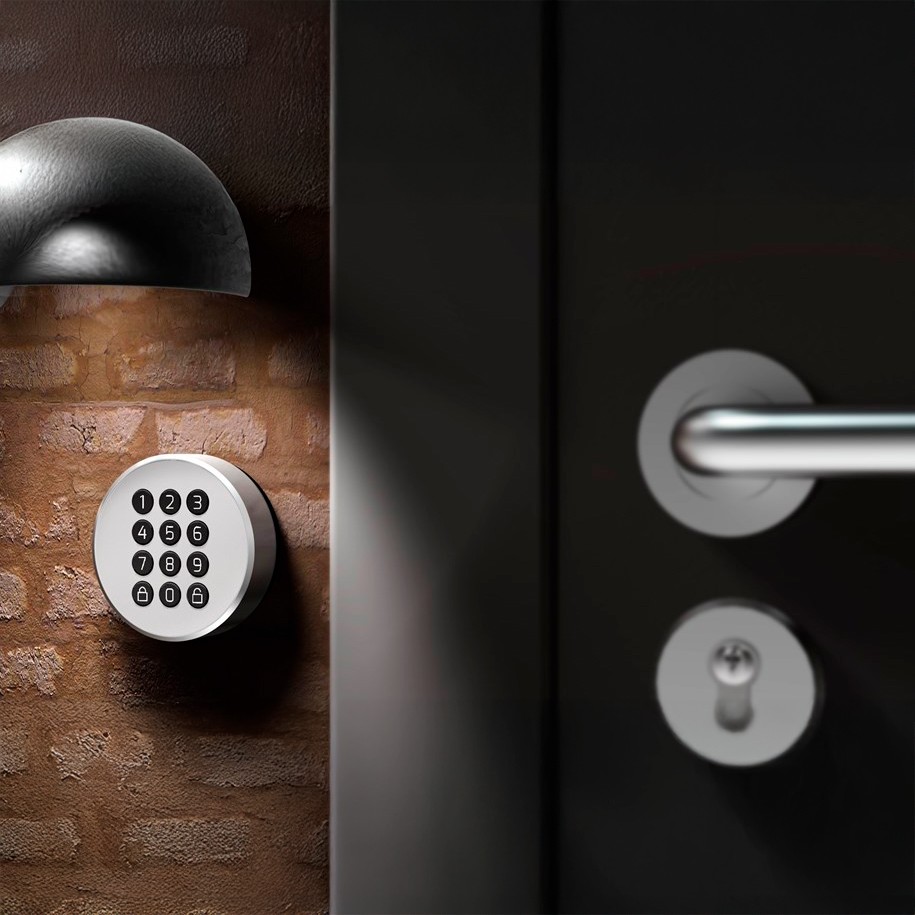 Danapad kodetastatur med BLE-forbindelse i elegant sølv design. Ideel til sikker adgangskontrol.