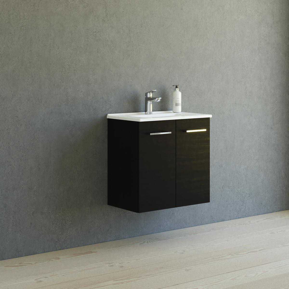 Møbelpakke med vaskeskab med 2 låger og Amber Mini håndvask i porcelæn. God hyldeplads, soft-close og justerbare låger. Vælg mellem seks farver. Leveres færdigsamlet.