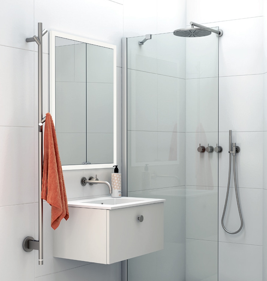 Elegant og funktionel Hydra håndklædetørrer fra Dansani i krom, 140 cm høj, med indbygget timer og el-tilslutning.