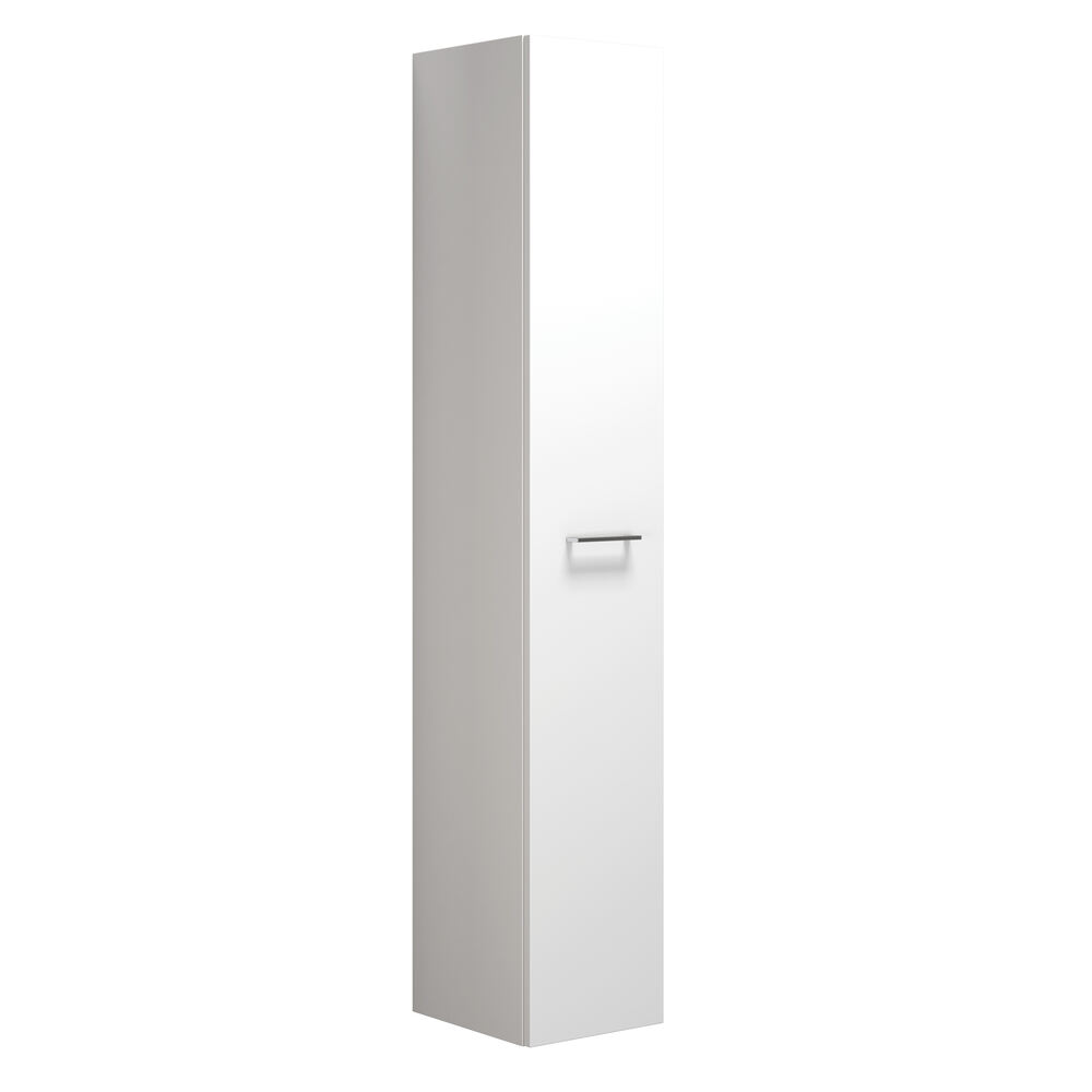Elegant og funktionelt højskab fra Dansani Mido+ i hvid højglans. Skabet giver masser af opbevaringsplads med 1 træhylde og 4 glashylder, ideelt til ethvert stilfuldt badeværelse.