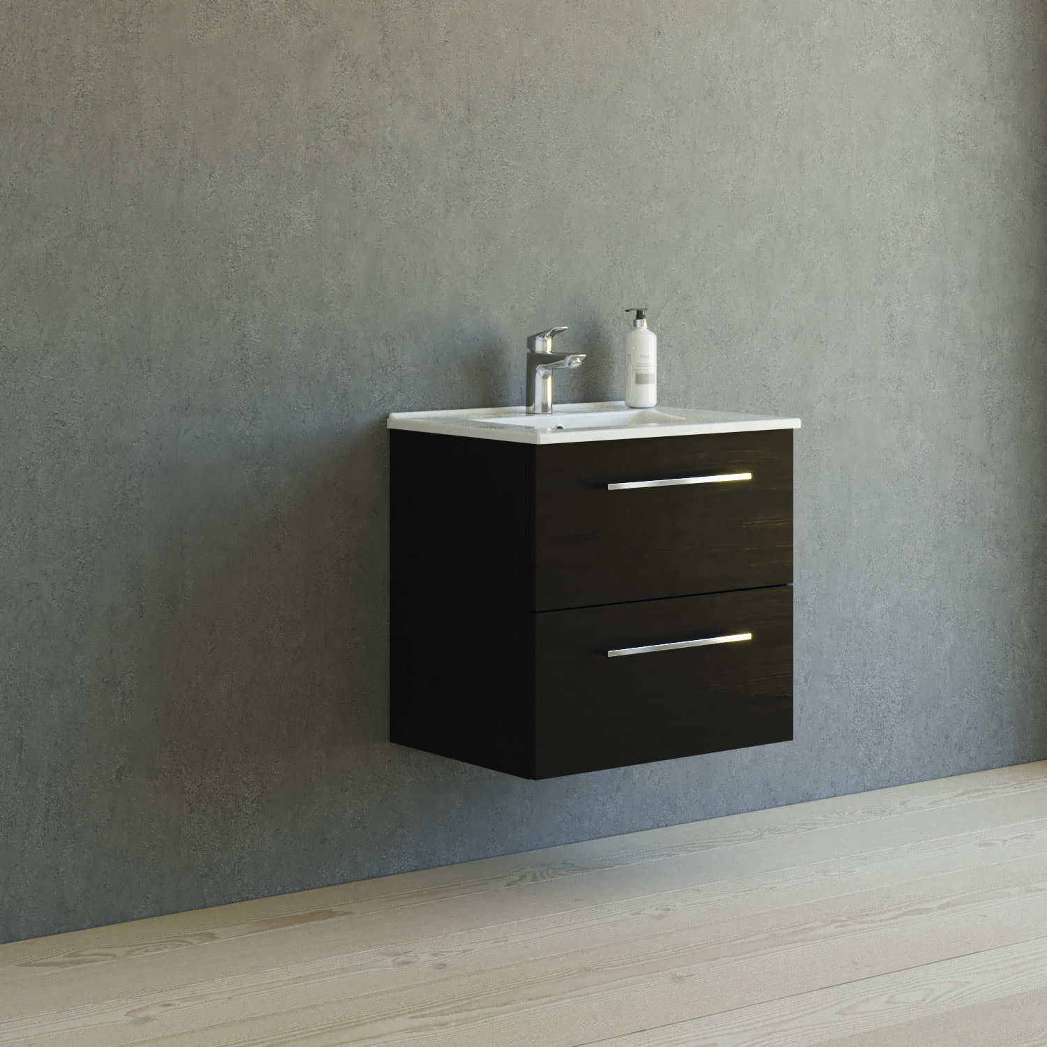 Møbelpakken er udstyret med to skuffer med fuldt udtræk, hvilket giver dig et godt overblik over dine badeværelsesartikler. Skufferne har metalsider med integreret skuffeudtræk samt selvindtræk og dæmpning, der sikrer en blød og lydløs lukning.