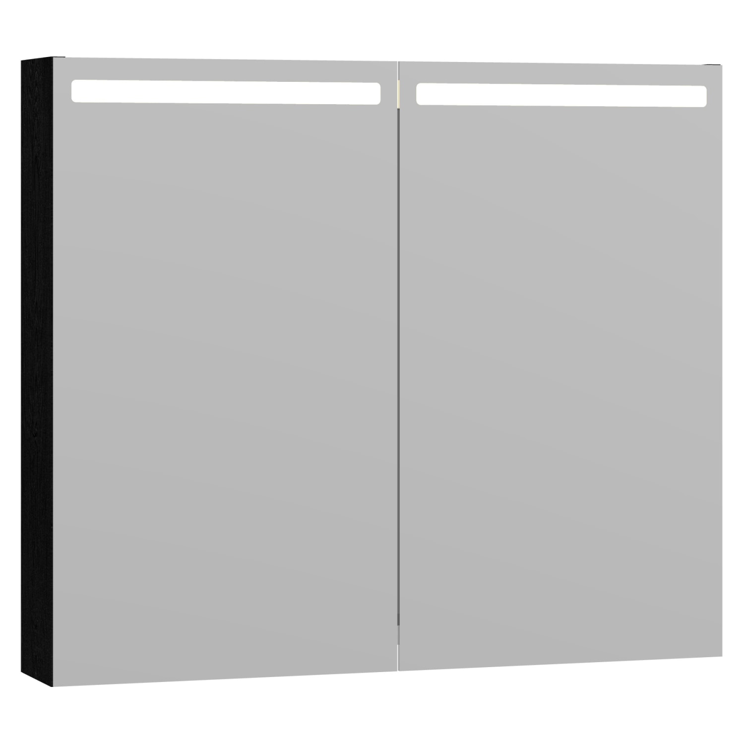 Elegant Dansani Mido+ spejlskab med integreret LED frontlight, stikkontakt og IP44-klassificering. Måler 70,4 x 80 x 14,5 cm i sort melamin.