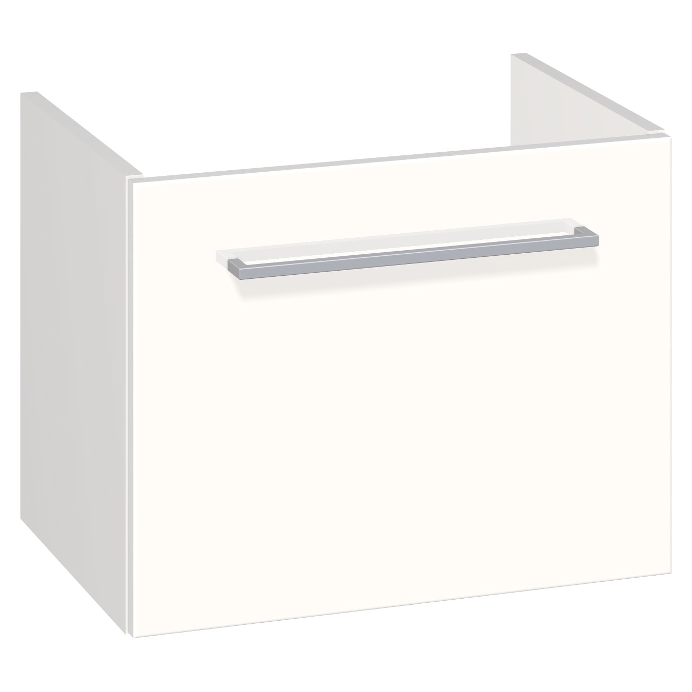 Skabet er fremstillet med en glat, hvid højglans overflade i melamin, hvilket sikrer en holdbar og rengøringsvenlig finish. Den integrerede soft close-funktion bidrager til en lydløs og skånsom lukning af skuffen, hvilket forbedrer den daglige brugeroplevelse.