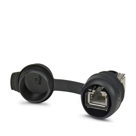 Servicedåse med RJ45 (bøsningsdel/bøsningsdel), 8-polet metal, CAT6A tilslutning, med beskyttelseslåg fra Phoenix Contact.