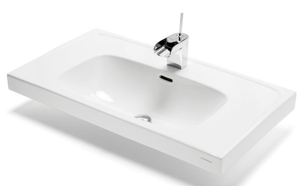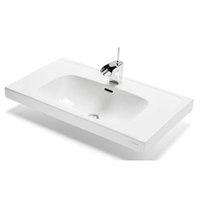 Deep porcelænsvask i hvid med en bredde på 1007 mm og dybde på 455 mm. Leveres med hanehul i midten og overløb.