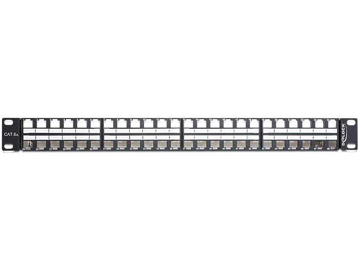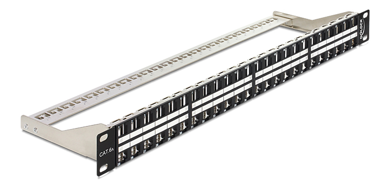 Dette 19" patch panel fra Delock giver pladsbesparende installation af 48 RJ45 Keystone moduler.