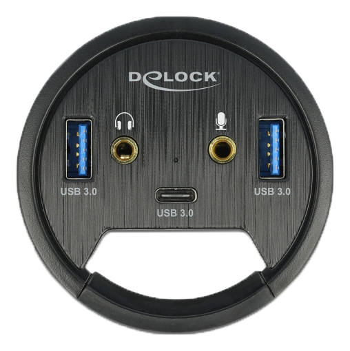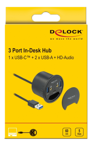 Denne hub fra Delock kan installeres i en eksisterende udskæring i skrivebordet med en diameter på 60 mm og kan tilsluttes en computer via USB type-A-interfacet. Den udvider computeren med to USB type-A-porte og én USB type-C-port.