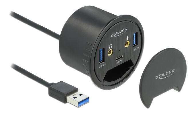 Denne hub fra Delock kan installeres i en eksisterende udskæring i skrivebordet med en diameter på 60 mm og kan tilsluttes en computer via USB type-A.