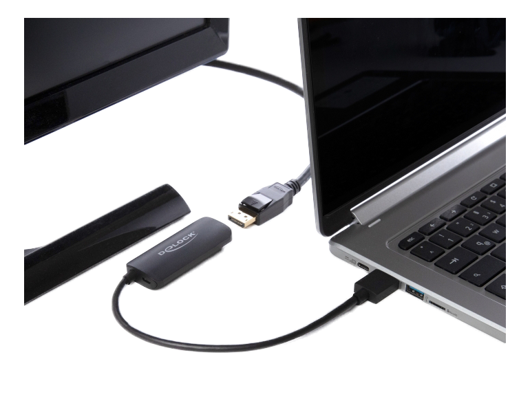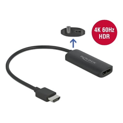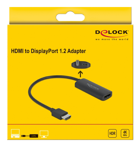 Denne adapter fra DeLock muliggør tilslutning af en DisplayPort-skærm til en ledig HDMI-port på en PC eller bærbar. Tilsluttes HDMI-stikket på PC'en og et eksisterende DisplayPort-kabel.