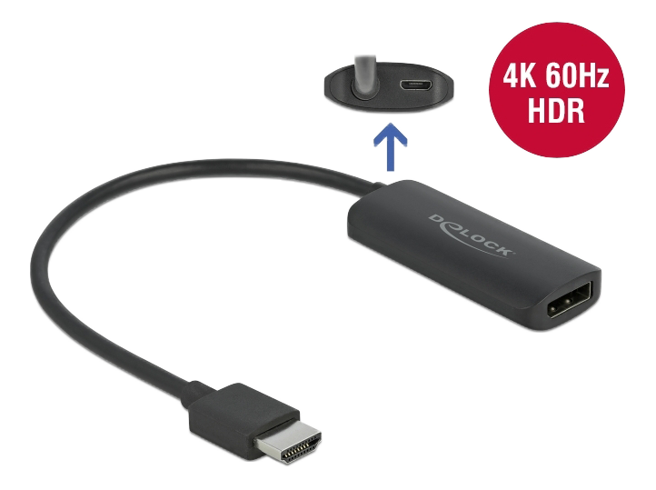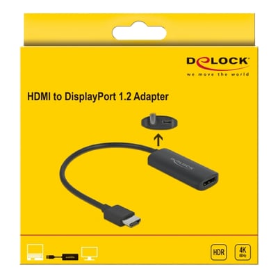 Denne adapter fra DeLock muliggør tilslutning af en DisplayPort-skærm til en ledig HDMI-port på en PC eller bærbar. Adapteren tilsluttes HDMI-stikket på PC'en eller den bærbare og forbindes med et eksisterende DisplayPort-kabel.