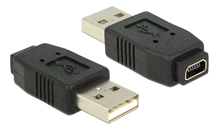 Delock USB 2.0 adapter, der ændrer en mini USB B han-port til en USB A han-port. Ideel til at forbinde forskellige enheder med minimal plads.
