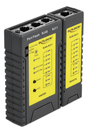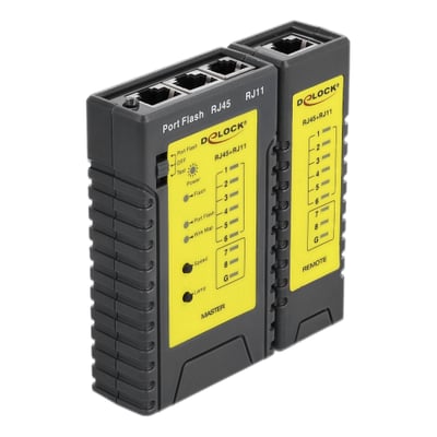 Med denne kabeltester fra Delock kan netværkskabler testes hurtigt og nemt. For at teste allerede installerede kabler kan den tilsluttede fjernbetjening fjernes fra testeren.