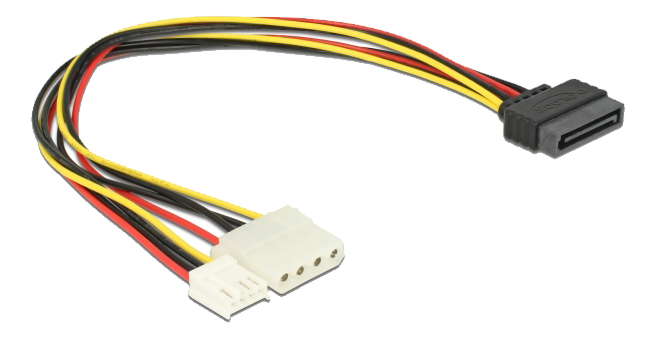 Dette 30 cm Y-strømkabel fra Delock kan tilsluttes en 15-pin SATA-strømtilslutning på en strømforsyning og kan levere strøm til en IDE HDD og et diskettedrev.