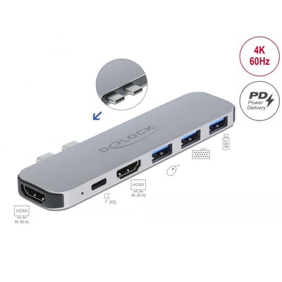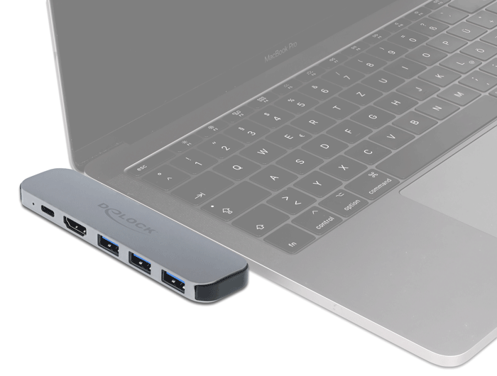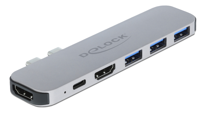 Denne dockingstation fra DeLock kan tilsluttes en MacBook med to tilstødende Thunderbolt™ 3-porte, f.eks. MacBook Pro. Mulighed for at tilslutte to skærme via HDMI.