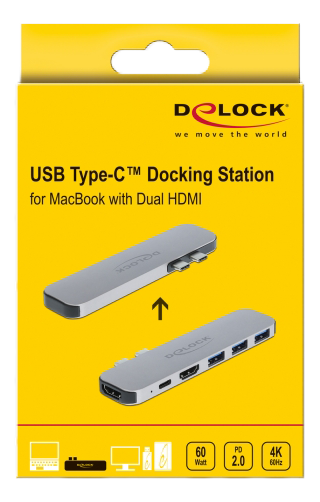 Denne dockingstation fra DeLock er designet til at blive forbundet til en MacBook via to tilstødende Thunderbolt™ 3-porte, hvilket gør den ideel til MacBook Pro-brugere. Den giver mulighed for at køre to skærme samtidigt via HDMI-udgangene.
