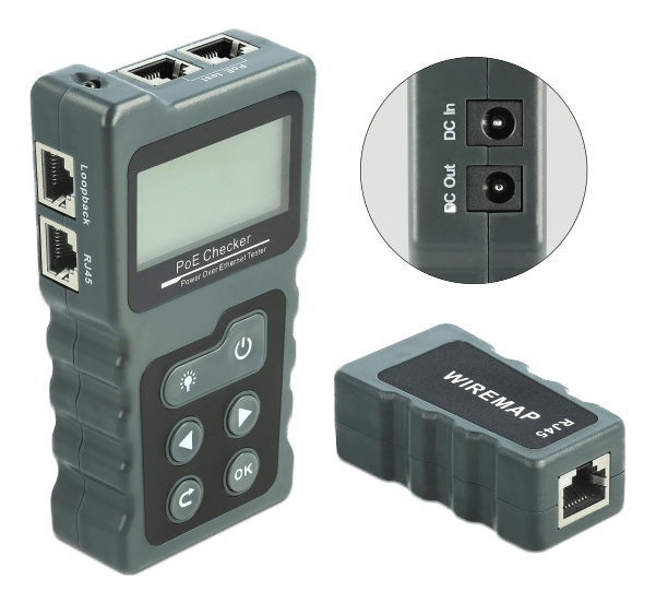 PoE-standarden og de anvendte ledningspar i en PoE-spændingskilde kan bestemmes. Med en tilsluttet belastning vises den faktiske spænding, polaritet, strøm og effekt i realtid.