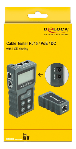 Med denne kabeltester fra Delock kan ledningsforbindelsen i netværkskabler testes hurtigt og nemt. Resultaterne vises tydeligt på det belyste LCD-display. Fjernenheden kan bruges til at teste allerede installerede kabler.