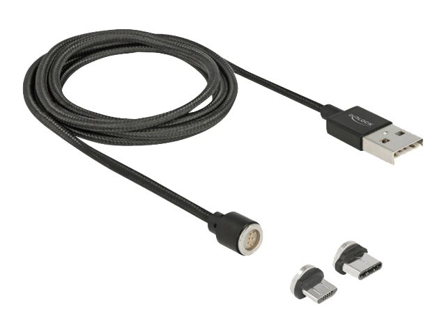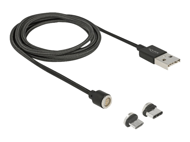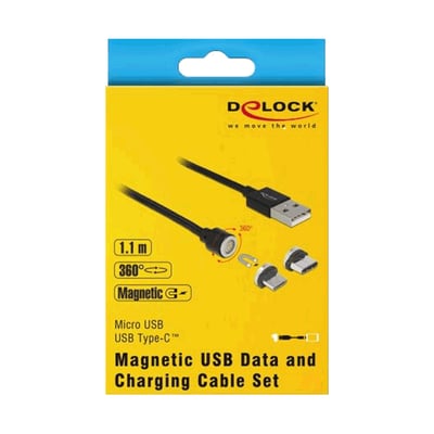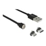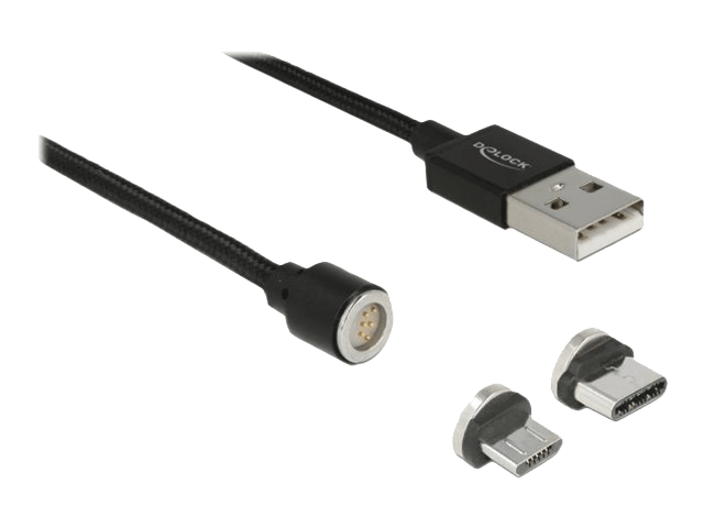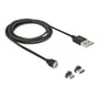 Delock USB data- og opladerkabel med magnet teknologi for hurtig tilslutning og frakobling. Inkluderer Micro USB-B og USB Type-C adaptere til opladning og dataoverførsel.