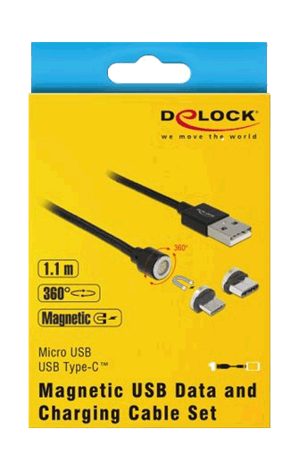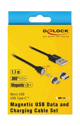 Dette USB data- og opladerkabel fra Delock udmærker sig ved sin magnetteknologi, som muliggør nem og hurtig tilslutning og frakobling mellem en enhed og strømkilden eller en computer. Ved at bruge en af de to medfølgende magnetiske adaptere kan forskellige mobile enheder, tablets osv. oplades enten via Micro USB-B eller USB Type-C interface, eller overføre data. Kablet understøtter desuden hurtig opladning med moderne USB-opladere.