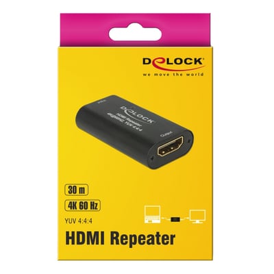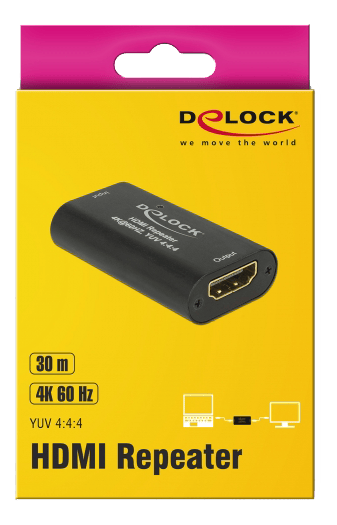 Denne HDMI repeater fra DeLock bruges til at forstærke et HDMI signal op til 30 m. Understøtter opløsninger op til Ultra HD (4K @ 60 Hz) og er nedad kompatibel til Full-HD 1080p.