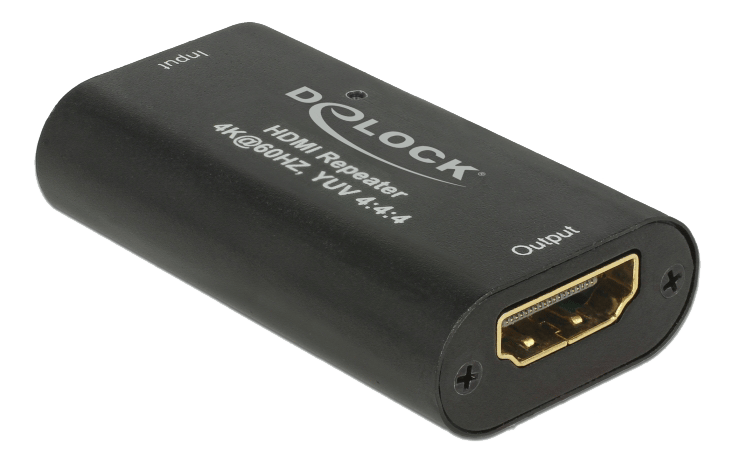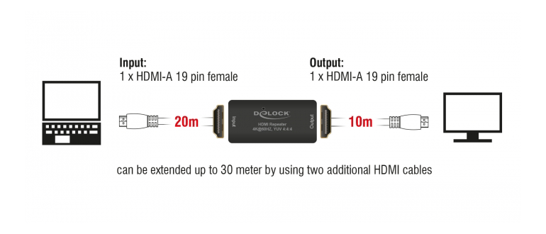 Denne HDMI repeater fra DeLock kan bruges til at forstærke et HDMI signal op til 30 m. Et kabel på op til 20 m kan tilsluttes fra en PC eller bærbar computer til repeaterens indgangsport, og i den anden ende kan et kabel på op til 10 m tilsluttes repeaterens udgangsport, som derefter forbindes til et display eller TV.