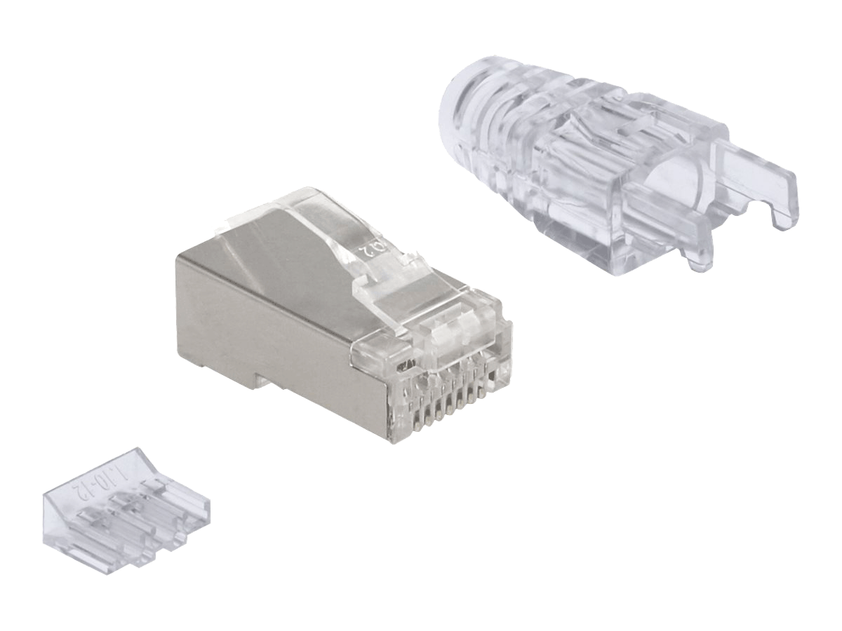 Dette højkvalitets RJ45 stik sæt fra Delock inkluderer afskærmede RJ45 stik med buet lås, passende bøjningsbeskyttelse og en kabelmanager for optimal installation af kabler fra 26 - 23 AWG.