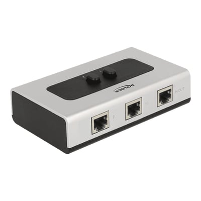 Manuel bidirectional RJ45 switch fra DeLock til tilslutning af forskellige enheder med RJ45-port. Muliggør skift mellem to enheder til ét netværk eller én enhed til to netværk.