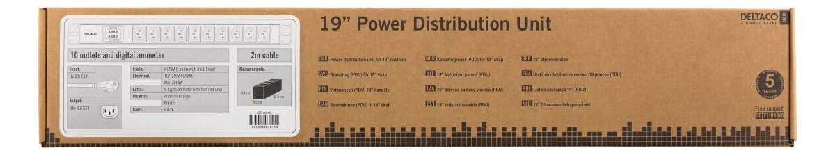 DELTACO 10-Outlet 19" power distribution unit, 2500W, C13, digital volt/amp meter, black 19" rack mountable power distribution unit (PDU) capable of delivering up to 10A/250...